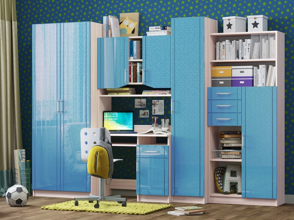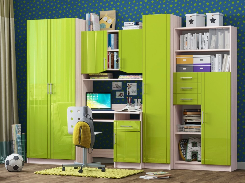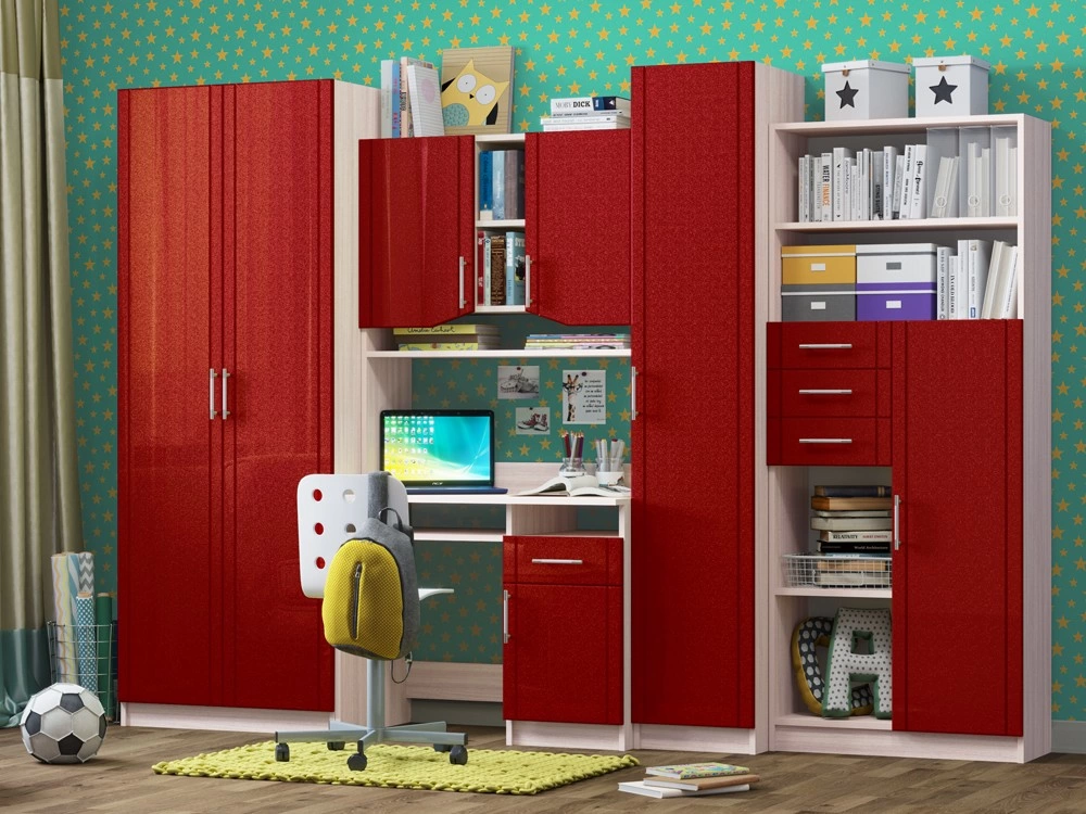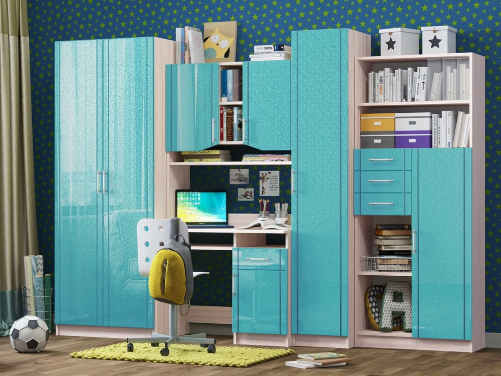 Детская Юниор МДФ – практичный и экономный вариант. Подойдет, как и для подростка, так и для маленьких хозяев комнаты. Вместительные отделения шкафа и большое количество ящиков помогут поддерживать порядок в комнате. Внутри шкаф оснащен штангой для плечиков и огромным количеством полок, что позволит поместить большое количество одежды.