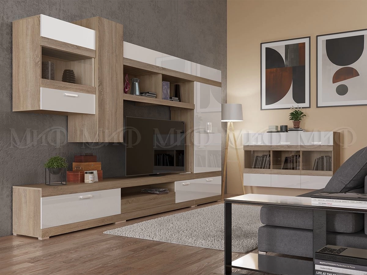 Гостиная "Авангард " - это удивительное сочетание изысканного вкуса и высокой функциональности. Воздушность белого глянца удачно подчеркивает теплый, древесный оттенок корпуса.