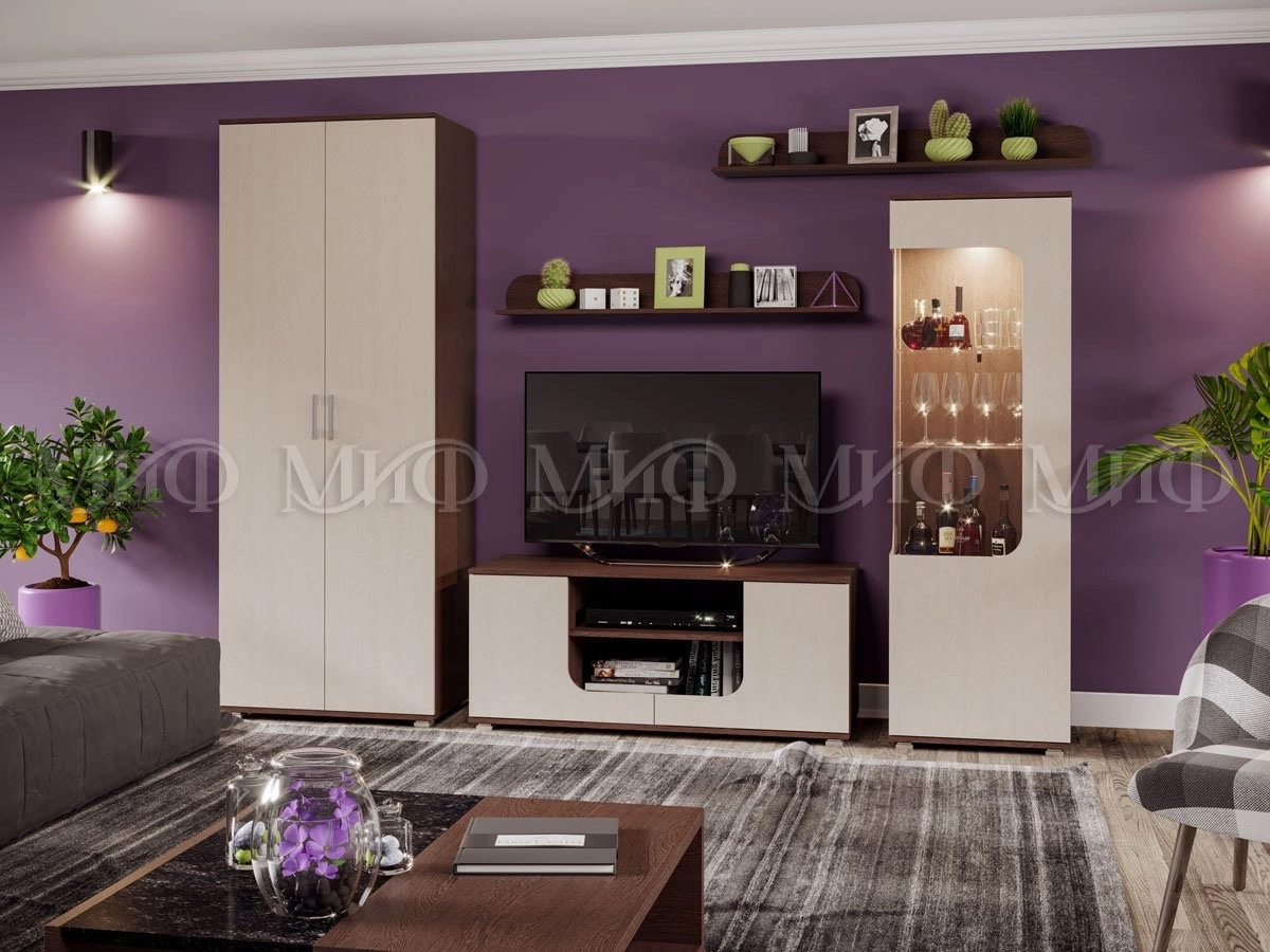 Гостиная "Олеандр" - дизайн гостиной с барной стойкой. Демонстрируемый вариант включает в себя барную секцию, навесные полки, платяной шкаф и тумбу под TV. При наличии свободного места возможно добавление шкафа и пенала. купить недорогую мини гостиную для дома можно при недостатке в квартире свободного пространства.
