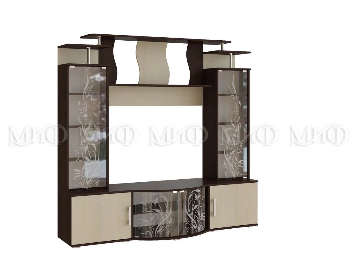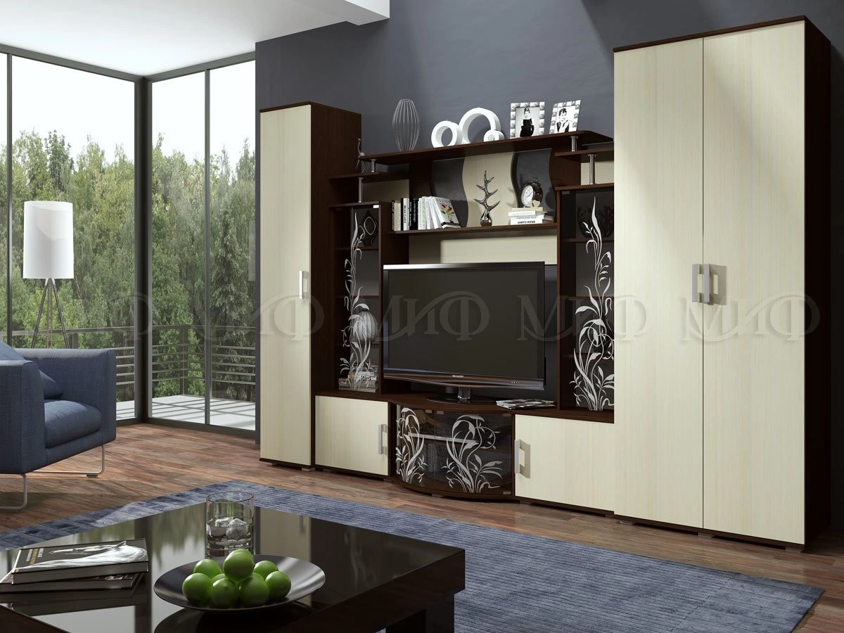 Актуальная модульная система для гостиной, с большой нишей под TV. Стеклянные дверцы стеллажей декорированы растительным узором. Роскошный вариант для стильного интерьера.